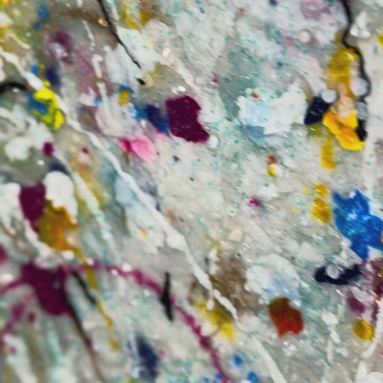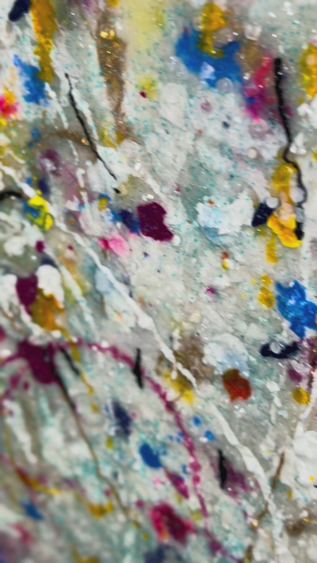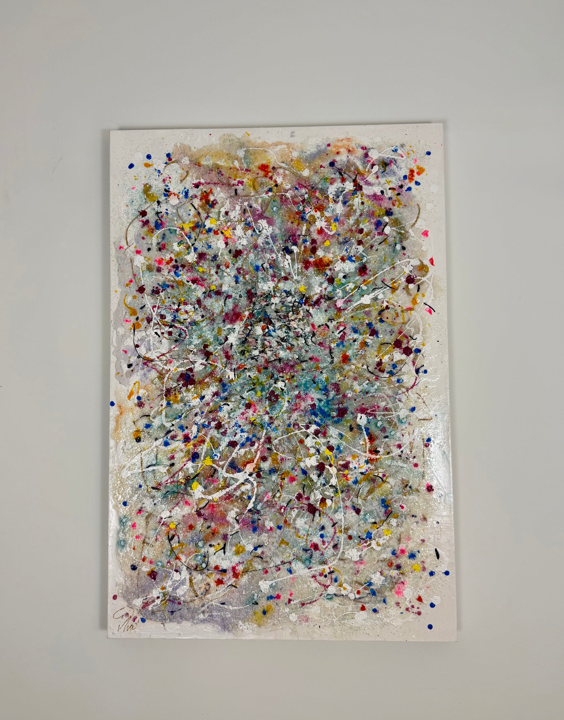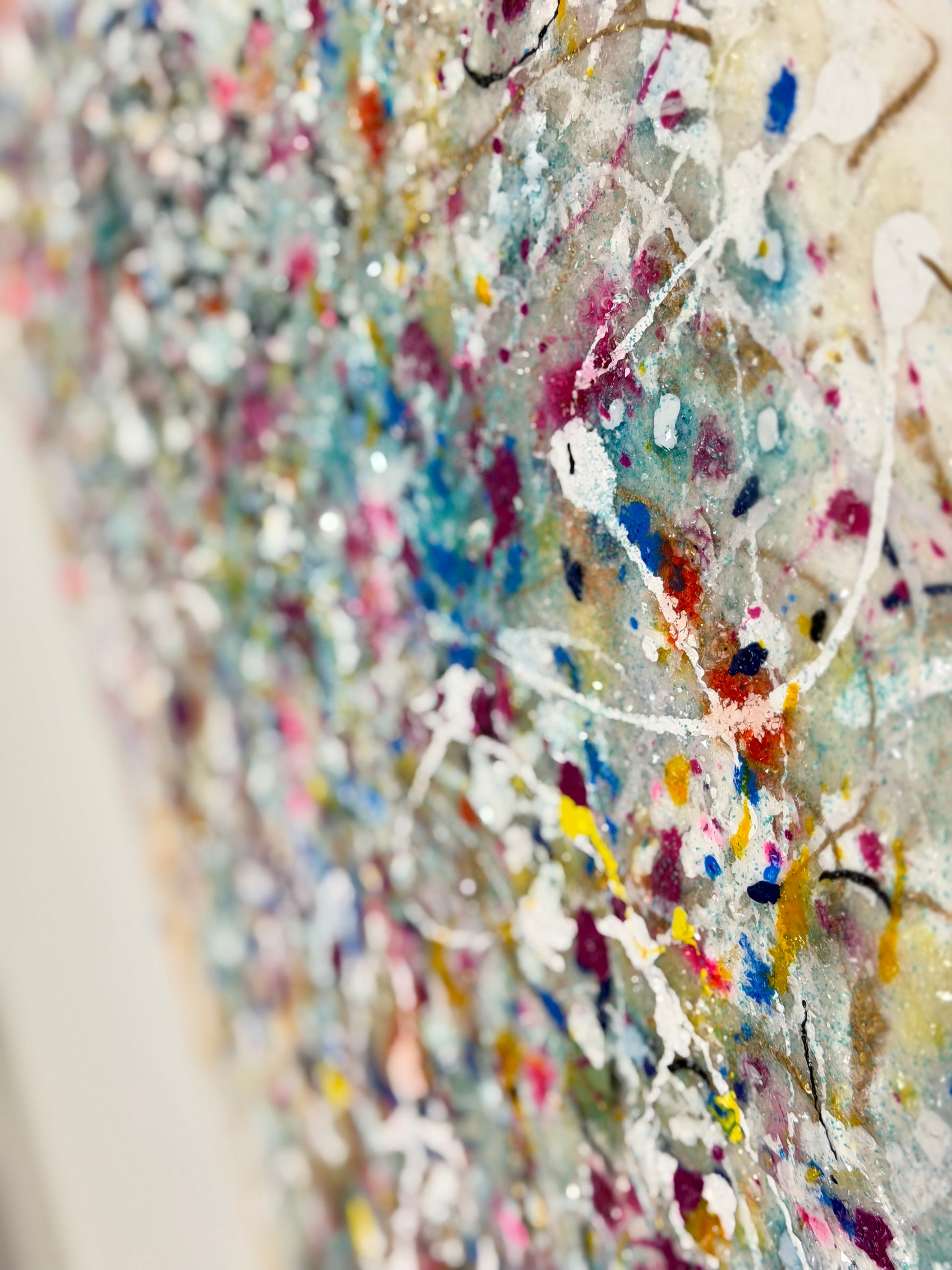 It resembles a cosmic garden, a wild bloom of frequencies and feelings, dancing in a state of becoming. The white lines streaking across the canvas feel like threads of light stitching invisible realms together, guiding the eye and whispering of interconnectedness.